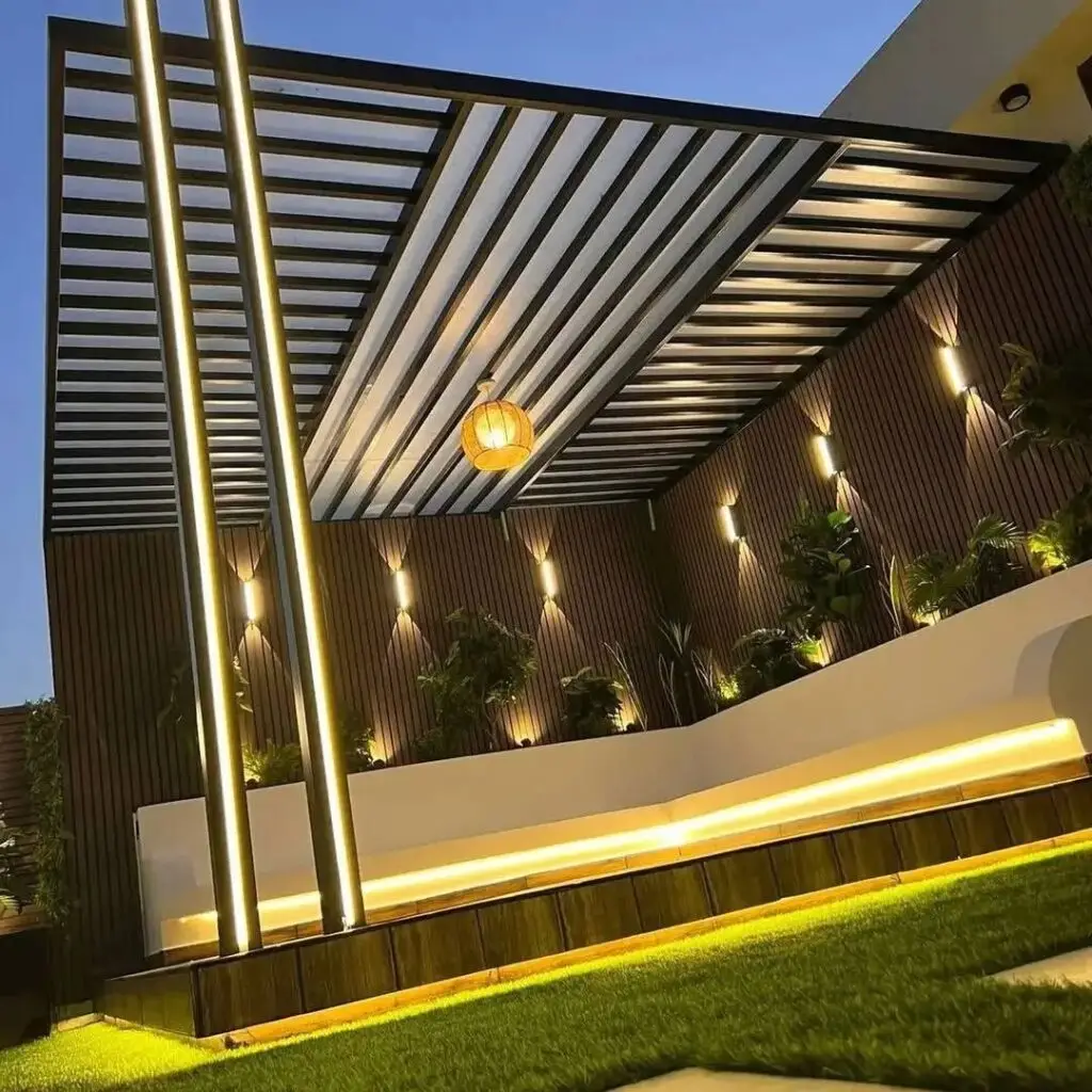 * الإضاءة المدمجة: يمكن دمج أنظمة إضاءة LED داخل هيكل المظلة لتوفير إضاءة جمالية ووظيفية للمساحات الخارجية ليلاً.